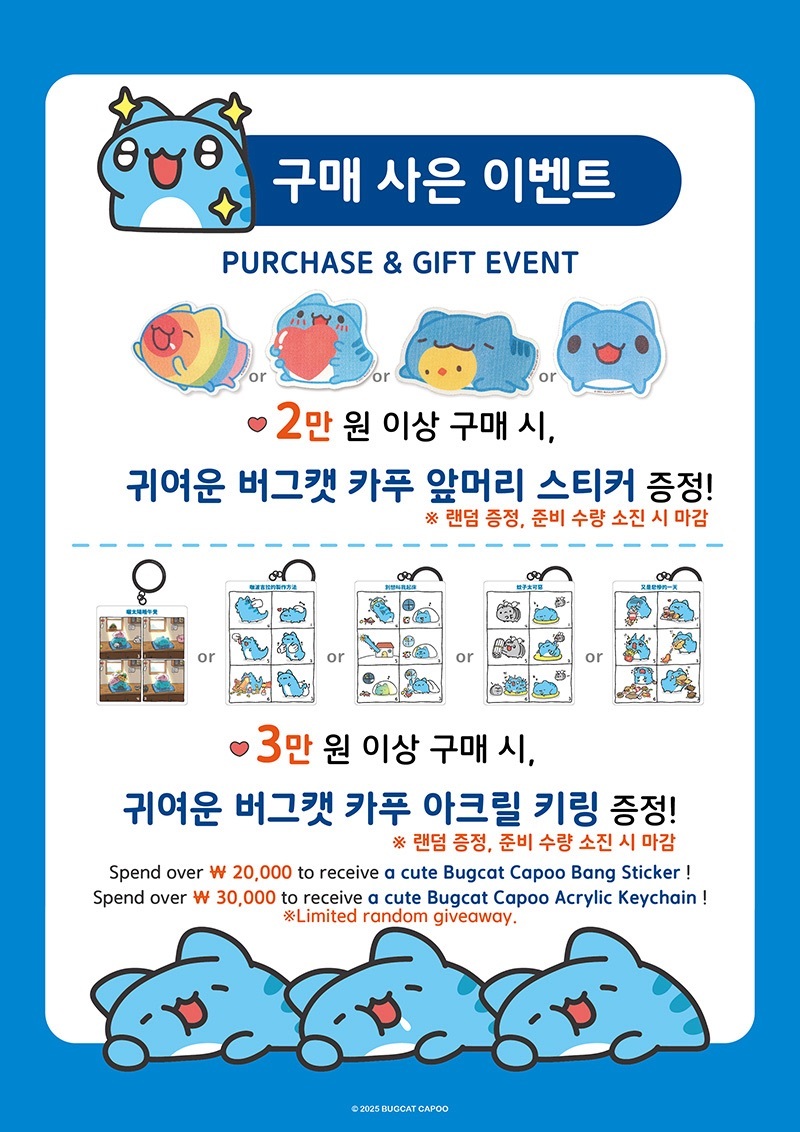 Spend over ₩ 30,000 to receive a cute Bugcat Capoo Acrylic Keychain !